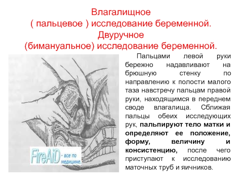 Методика исследования. Руки спускают со дна матки на