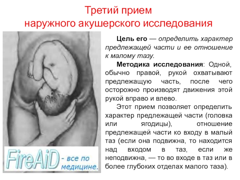 Этот прием позволяет определить характер предлежащей части (головка или ягодицы), отношение предлежащей части ко входу в малый таз (если она подвижна, то находится над входом в таз, если же неподвижна, — то во входе в таз или в более глубоких отделах малого таза).