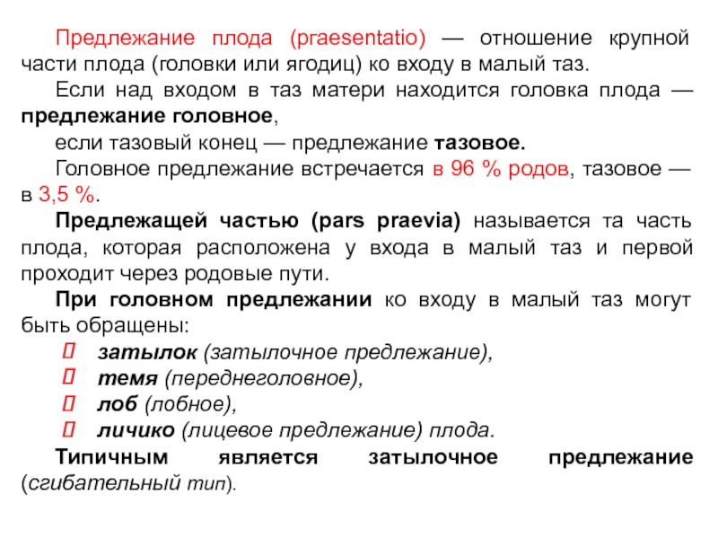 Предлежащей частью (pars praevia) называется та часть плода, которая расположена у входа в малый таз и первой проходит через родовые пути.