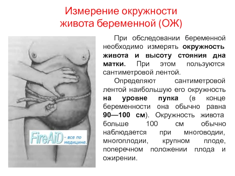 сантиметровой лентой наибольшую его окружность на уровне пупка (в конце беременности она обычно равна 90—100 см). Окружность живота больше 100 см обычно наблюдается при многоводии, многоплодии, крупном плоде, поперечном положении плода и ожирении.