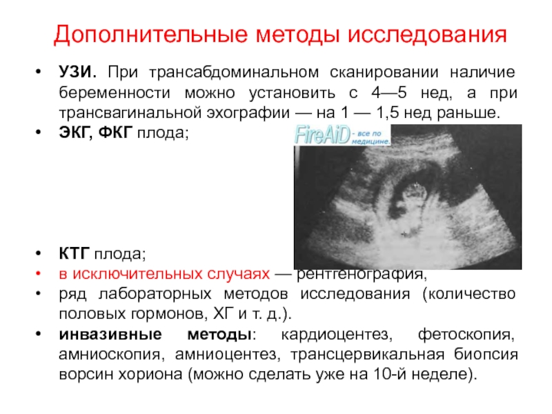 инвазивные методы: кардиоцентез, фетоскопия, амниоскопия, амниоцентез, трансцервикальная биопсия ворсин хориона (можно сделать уже на 10-й неделе).