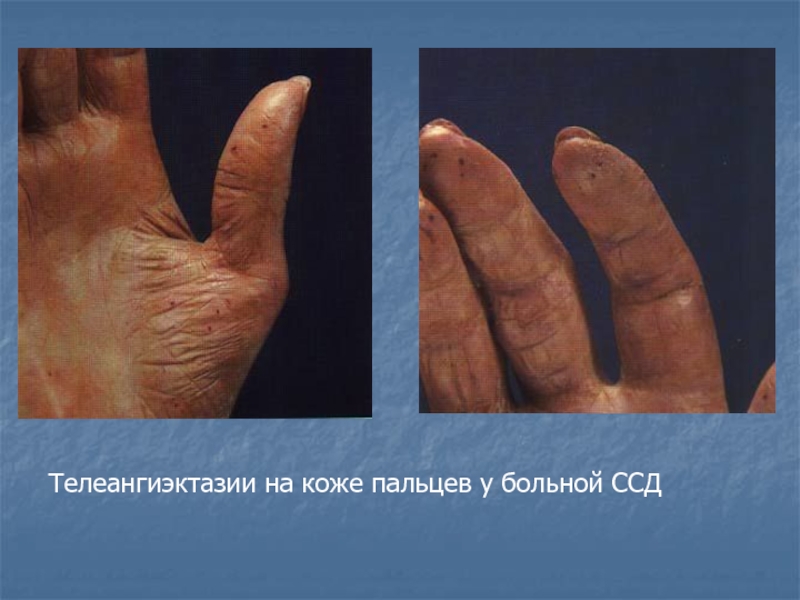 Слайд 15Телеангиэктазии на коже пальцев у больной ССД