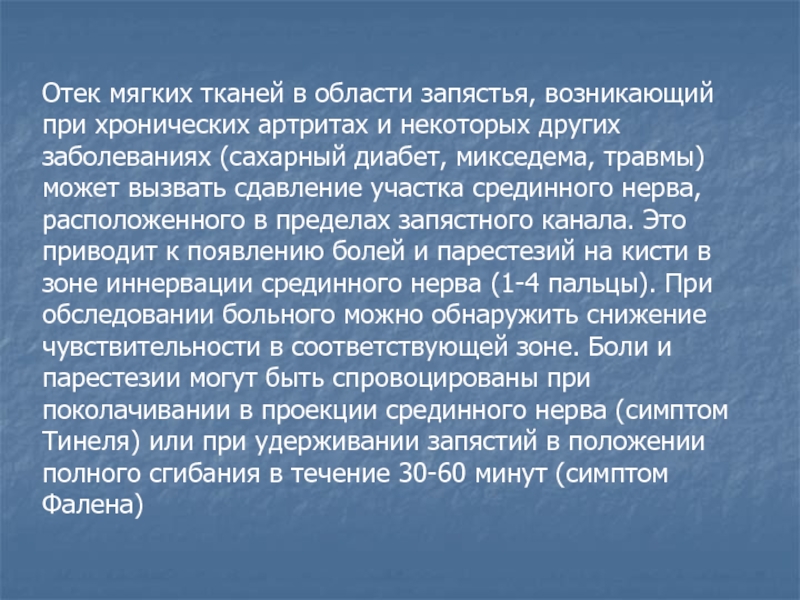 сдавление участка срединного нерва, расположенного в пределах запястного канала. Это приводит к появлению болей и парестезий на кисти в зоне иннервации срединного нерва (1-4 пальцы). При обследовании больного можно обнаружить снижение чувствительности в соответствующей зоне. Боли и парестезии могут быть спровоцированы при поколачивании в проекции срединного нерва (симптом Тинеля) или при удерживании запястий в положении полного сгибания в течение 30-60 минут (симптом Фалена)