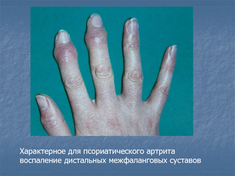 Слайд 9Характерное для псориатического артрита воспаление дистальных межфаланговых суставов