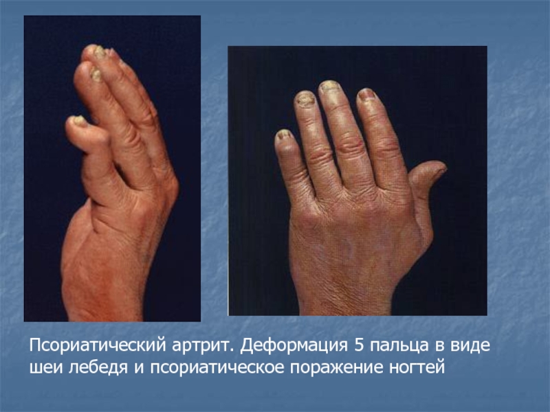 Слайд 8Псориатический артрит. Деформация 5 пальца в виде шеи лебедя и