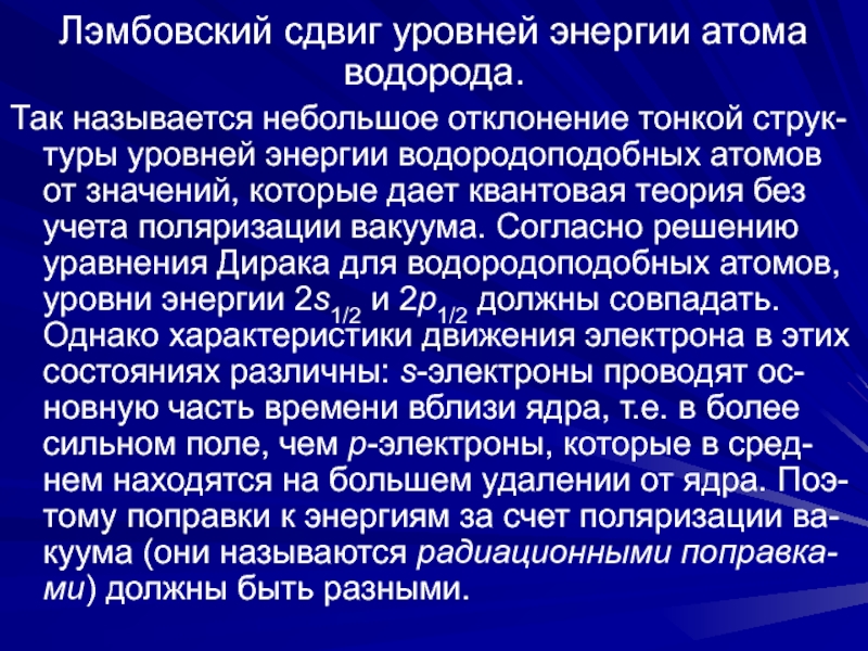 квантовая теория без учета поляризации вакуума. Согласно решению уравнения Дирака для водородоподобных атомов, уровни энергии 2s1/2 и 2p1/2 должны совпадать. Однако характеристики движения электрона в этих состояниях различны: s-электроны проводят ос-новную часть времени вблизи ядра, т.е. в более сильном поле, чем p-электроны, которые в сред-нем находятся на большем удалении от ядра. Поэ-тому поправки к энергиям за счет поляризации ва-куума (они называются радиационными поправка-ми) должны быть разными.