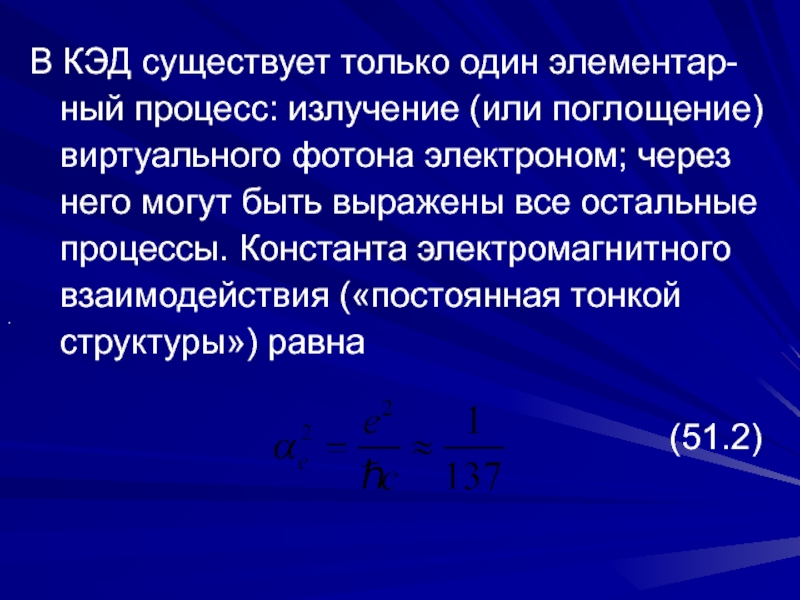 Слайд 12В КЭД существует только один элементар-ный процесс: излучение (или поглощение)