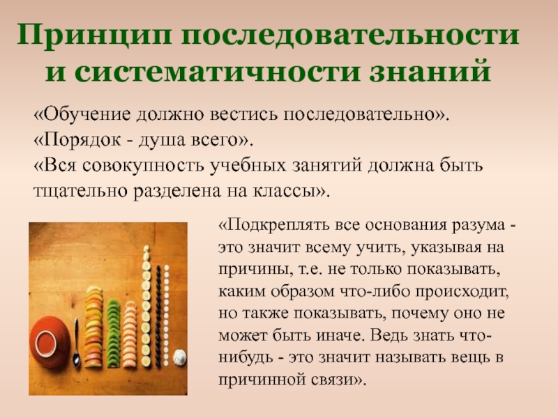 То, что нужно знать о вещах, должно быть «преподаваемо посредством самих вещей, т.е. должно, насколько возможно, выставлять для созерцания, осязания, слушания, обоняния сами вещи, либо заменяющие их изображения».