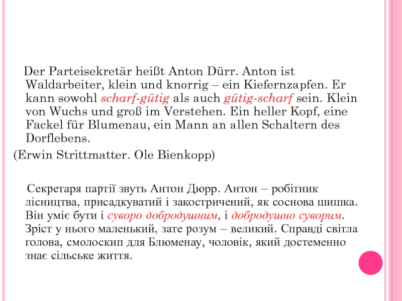 Слайд 10 Der Parteisekretär heißt Anton Dürr. Anton ist Waldarbeiter,