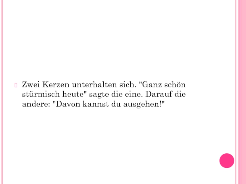 Zwei Kerzen unterhalten sich. "Ganz schön stürmisch heute" sagte die