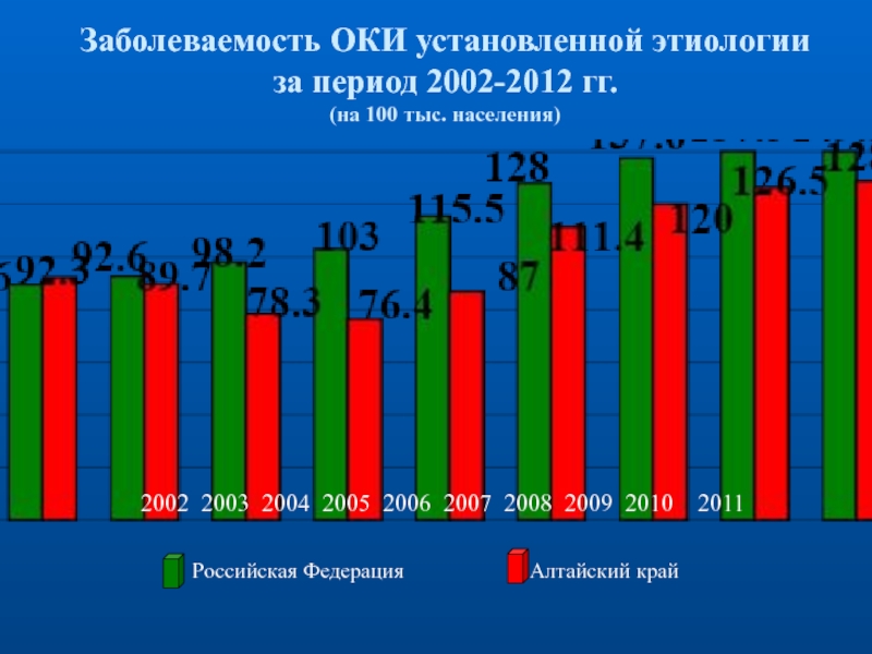 Слайд 5Заболеваемость ОКИ установленной этиологии за период 2002-2012 гг.