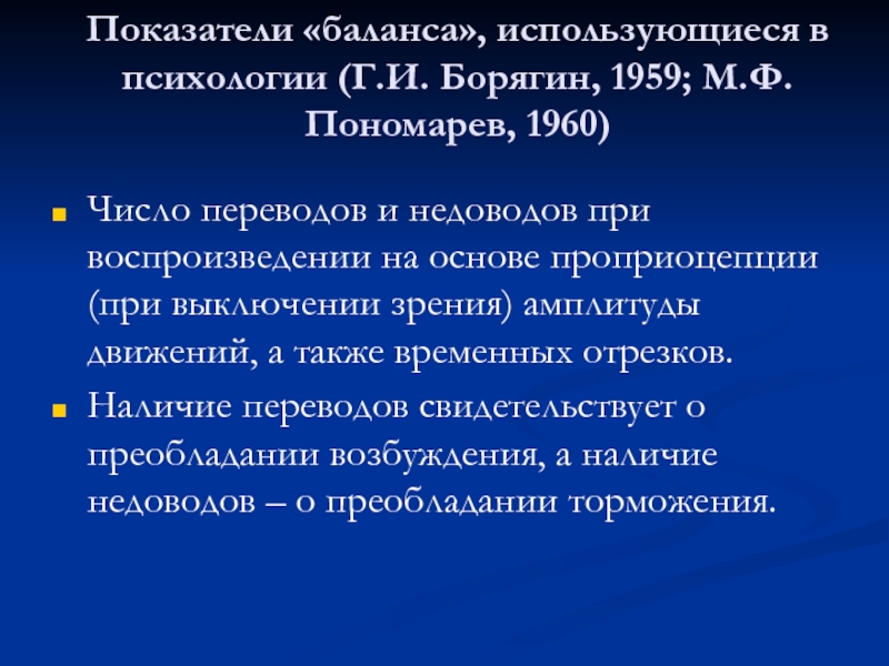 Показатели «баланса», использующиеся в психологии (Г.И. Борягин, 1959; М.Ф. Пономарев,