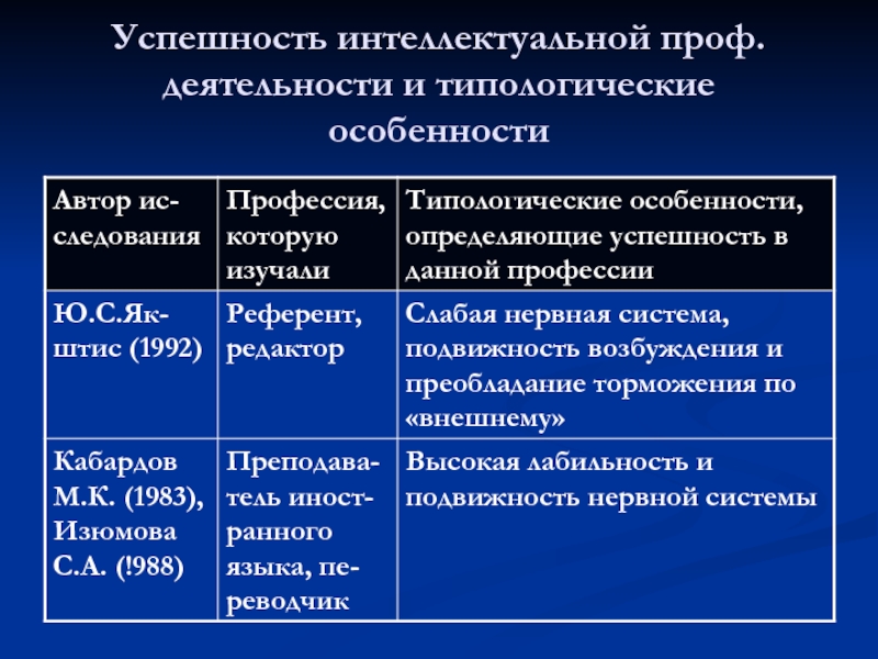 Слайд 60Успешность интеллектуальной проф. деятельности и типологические особенности