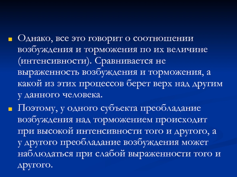 Слайд 15Однако, все это говорит о соотношении возбуждения и торможения по