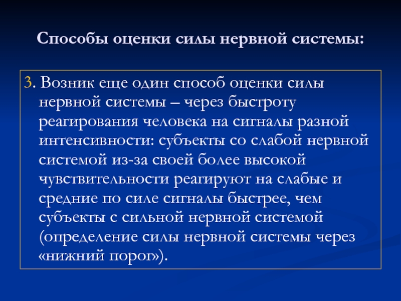 разной интенсивности: субъекты со слабой нервной системой из-за своей более высокой чувствительности реагируют на слабые и средние по силе сигналы быстрее, чем субъекты с сильной нервной системой (определение силы нервной системы через «нижний порог»).