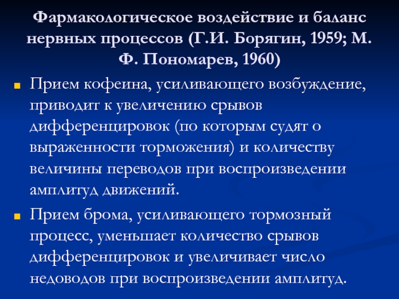 Слайд 14Фармакологическое воздействие и баланс нервных процессов (Г.И. Борягин, 1959; М.Ф.