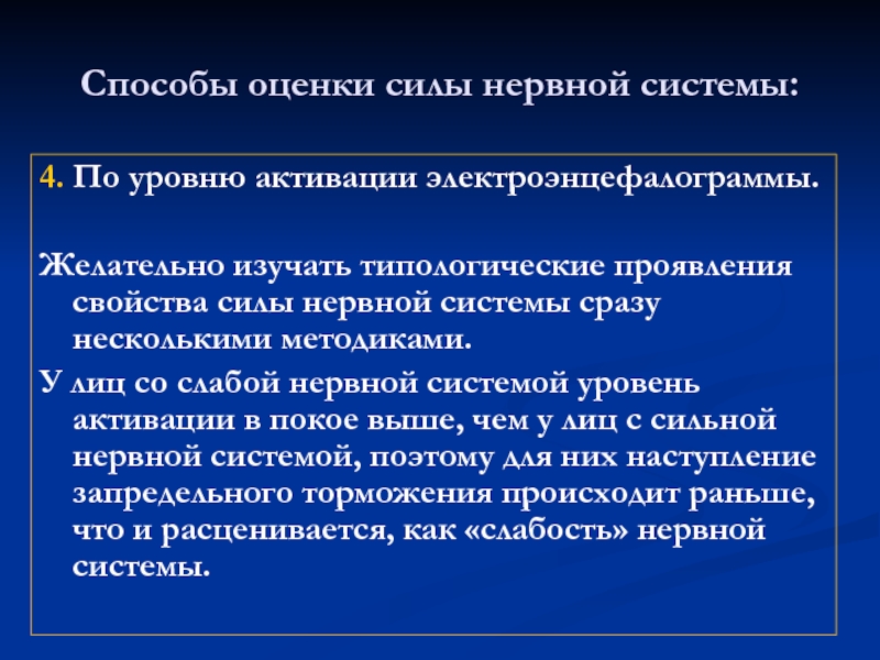со слабой нервной системой уровень активации в покое выше, чем у лиц с сильной нервной системой, поэтому для них наступление запредельного торможения происходит раньше, что и расценивается, как «слабость» нервной системы.