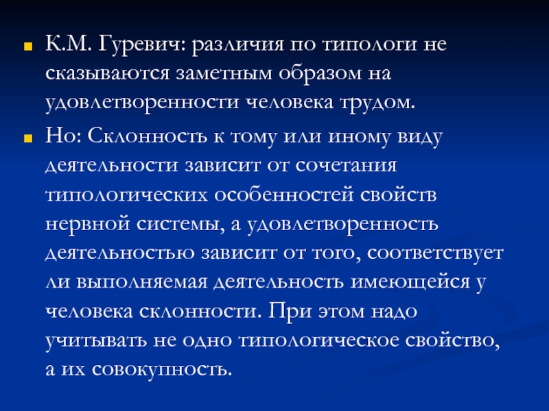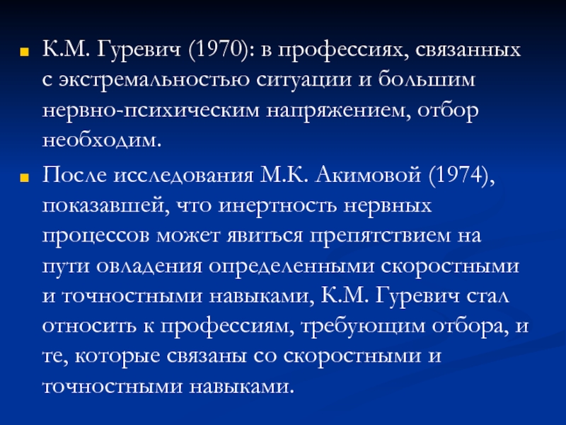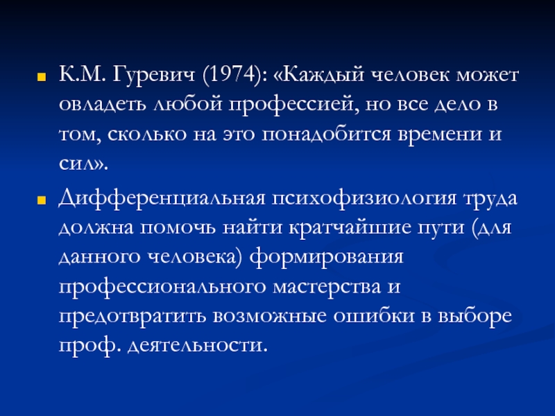 Слайд 21К.М. Гуревич (1974): «Каждый человек может овладеть любой профессией, но