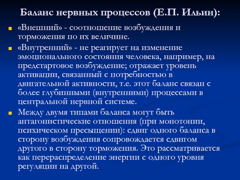 Слайд 17Баланс нервных процессов (Е.П. Ильин):