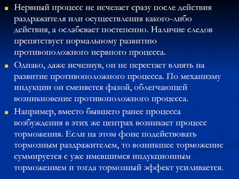 Слайд 10Нервный процесс не исчезает сразу после действия раздражителя или осуществления