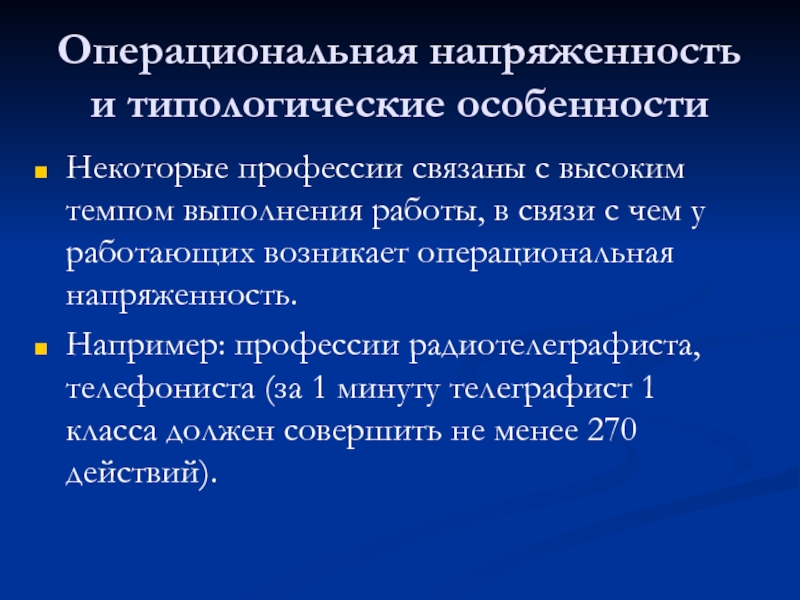 Например: профессии радиотелеграфиста, телефониста (за 1 минуту телеграфист 1 класса должен совершить не менее 270 действий).