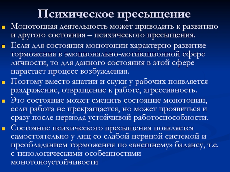 Состояние психического пресыщения появляется самостоятельно у лиц со слабой нервной системой и преобладанием торможения по «внешнему» балансу, т.е. с типологическими особенностями монотоноустойчивости