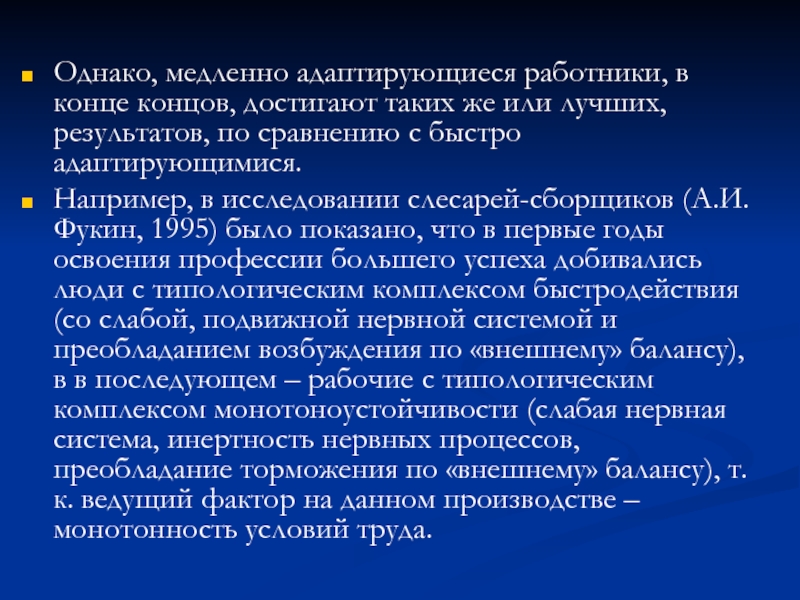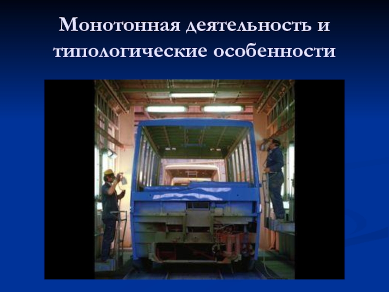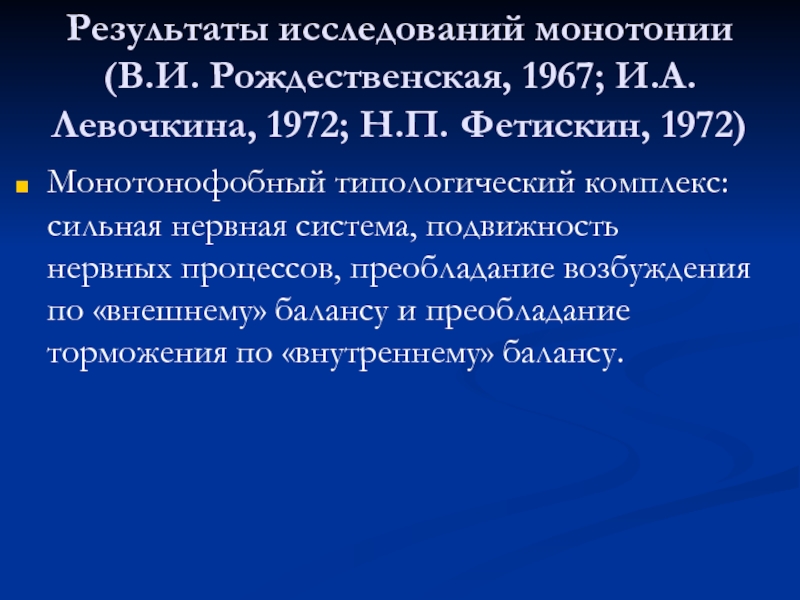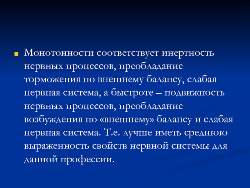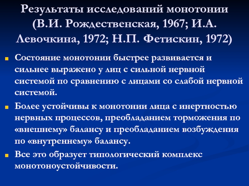 Более устойчивы к монотонии лица с инертностью нервных процессов, преобладанием торможения по «внешнему» балансу и преобладанием возбуждения по «внутреннему» балансу.