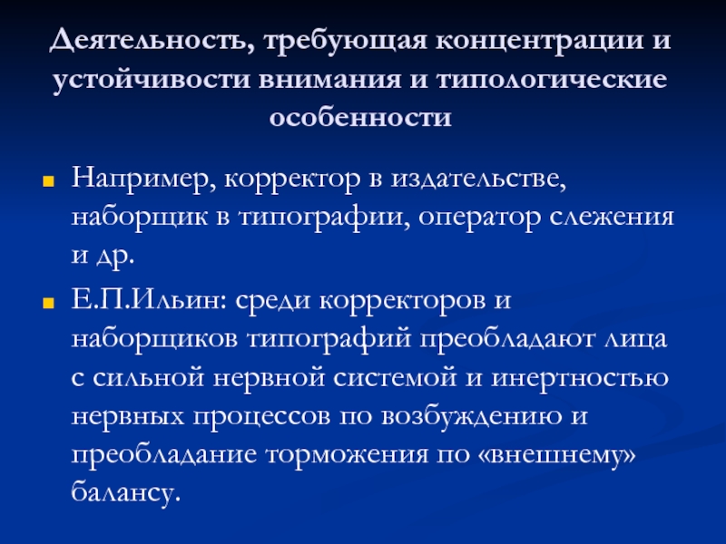 Слайд 53Деятельность, требующая концентрации и устойчивости внимания и типологические особенности
