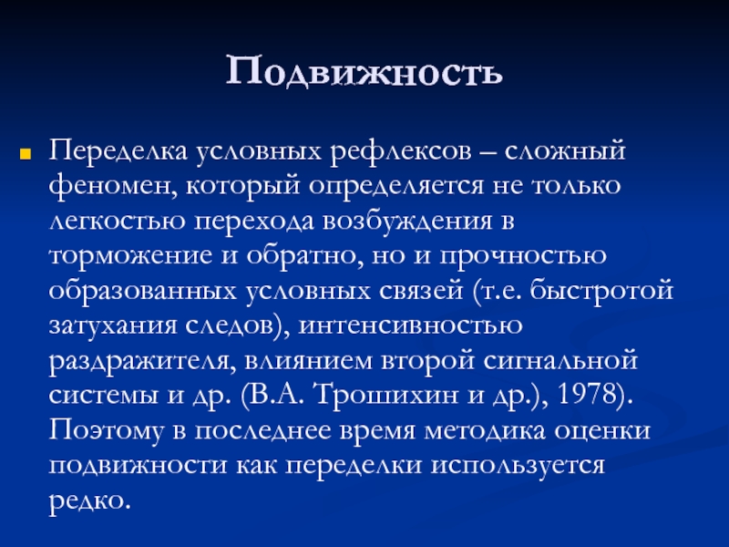 образованных условных связей (т.е. быстротой затухания следов), интенсивностью раздражителя, влиянием второй сигнальной системы и др. (В.А. Трошихин и др.), 1978). Поэтому в последнее время методика оценки подвижности как переделки используется редко.