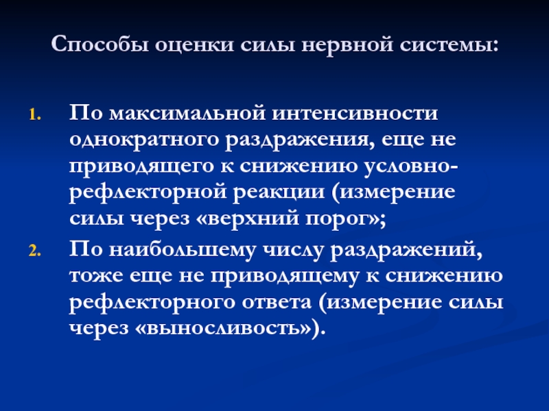 было выявлено, что чем больше интенсивность раздражителя или чем чаще он применяется, тем больше ответная условно-рефлекторная реакция. Однако, при достижении определенной интенсивности или частоты раздражения условно-рефлекторный ответ начинает снижаться.