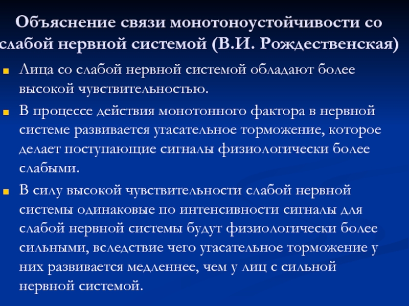 Слайд 42Объяснение связи монотоноустойчивости со слабой нервной системой (В.И. Рождественская)