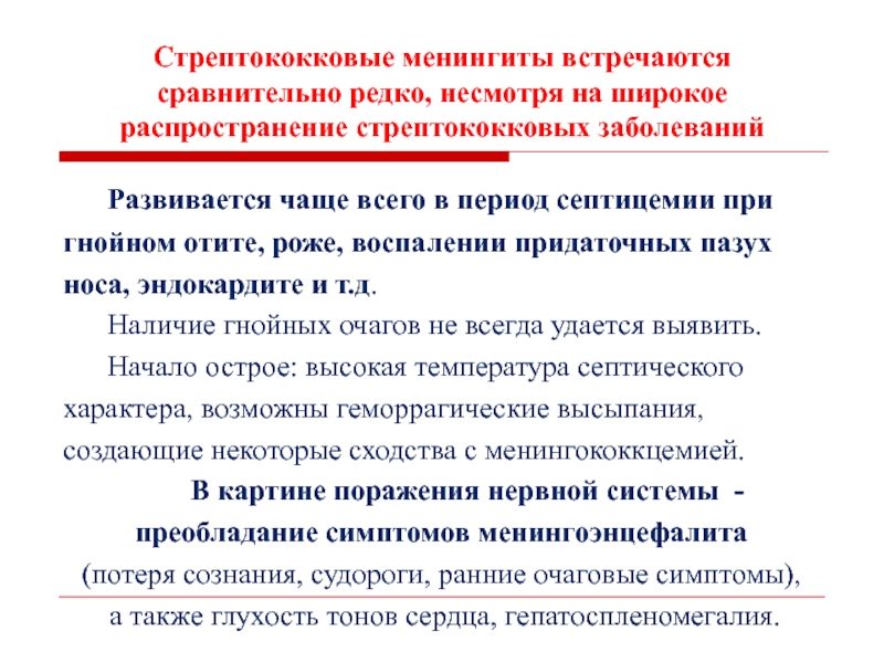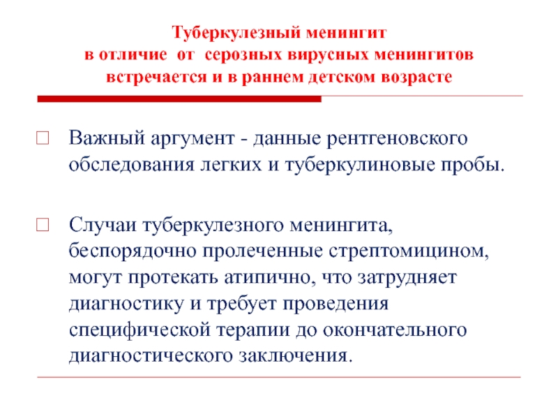 Случаи туберкулезного менингита, беспорядочно пролеченные стрептомицином, могут протекать атипично, что затрудняет диагностику и требует проведения специфической терапии до окончательного диагностического заключения.