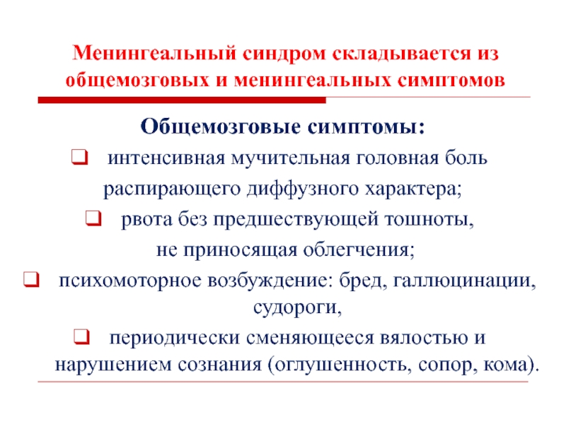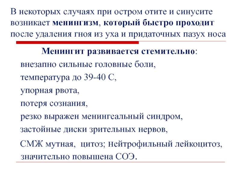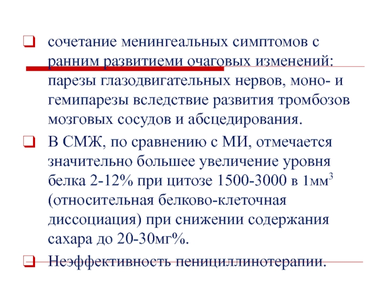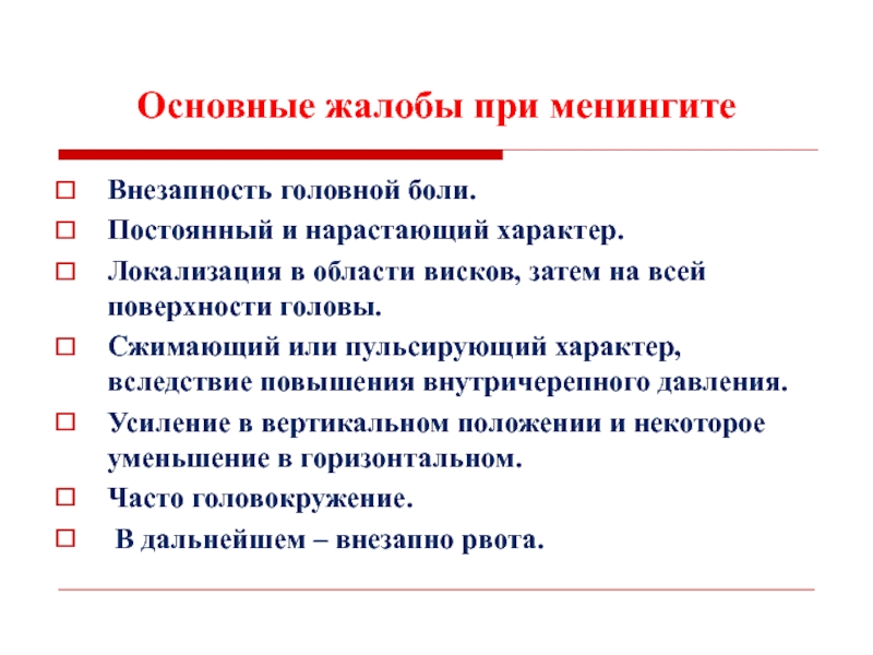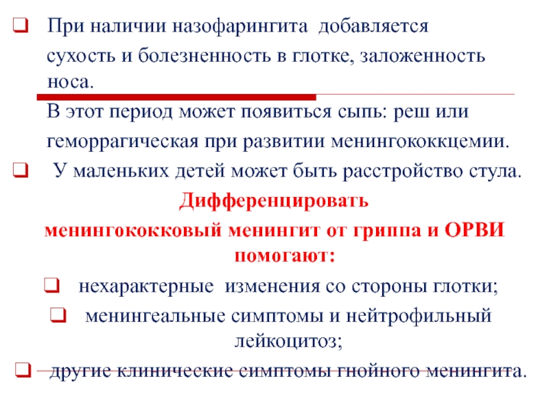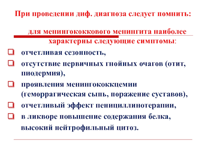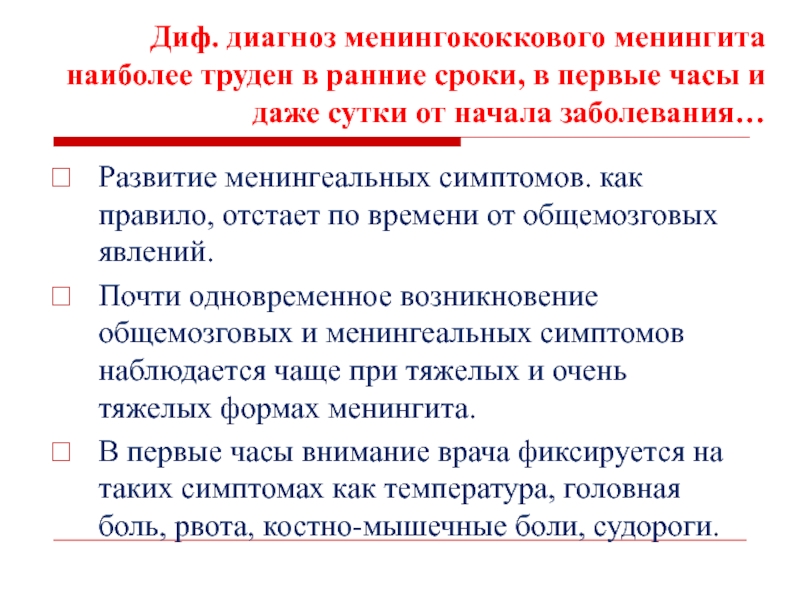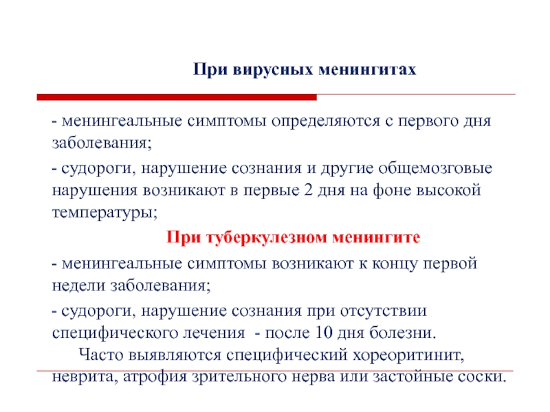 - менингеальные симптомы возникают к концу первой недели заболевания;