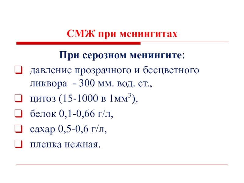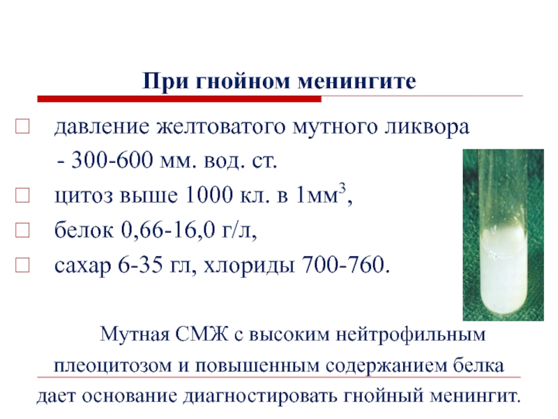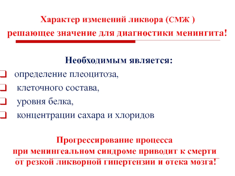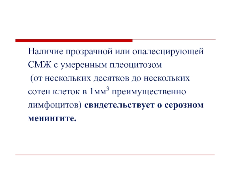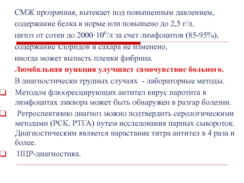 Давление ликвора несколько повышено, цитоз умеренный 15-200·106/л. с преобладанием лимфоцитов 60-70%, содержание белка и сахара слегка повышено.