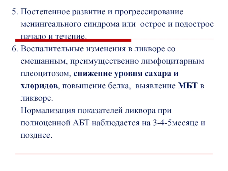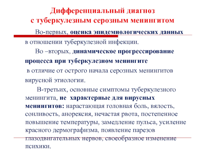 В-третьих, основные симптомы туберкулезного менингита, не характерные для вирусных менингитов: нарастающая головная боль, вялость, сонливость, анорексия, нечастая рвота, постепенное повышение температуры, замедление пульса, усиление красного дермографизма, появление парезов глазодвигательных нервов, своеобразное изменение психики.