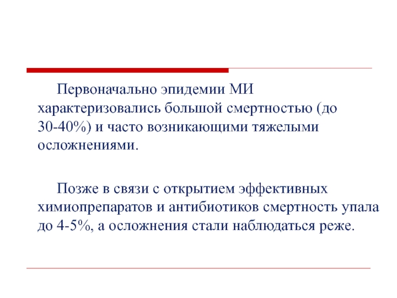Слайд 5 Первоначально эпидемии МИ характеризовались большой смертностью (до 30-40%) и часто