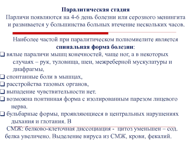 Парличи появляются на 4-6 день болезни или серозного менингита
