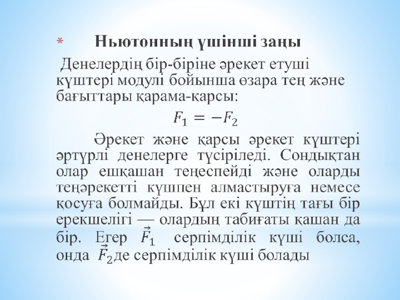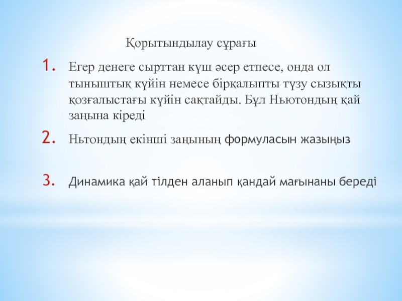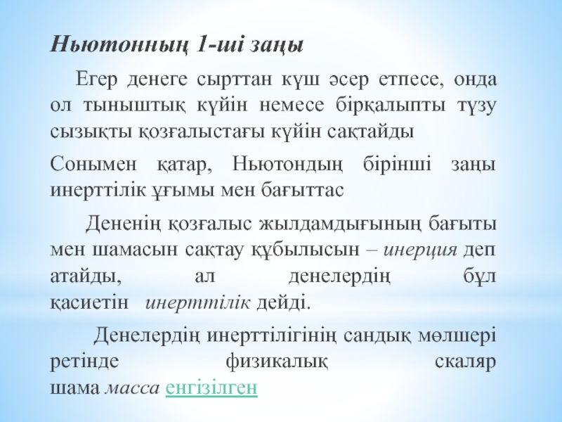 Ньютонның 1-шi заңы	Егер денеге сырттан күш әсер етпесе, онда ол тыныштық күйін немесе бірқалыпты түзу сызықты қозғалыстағы
