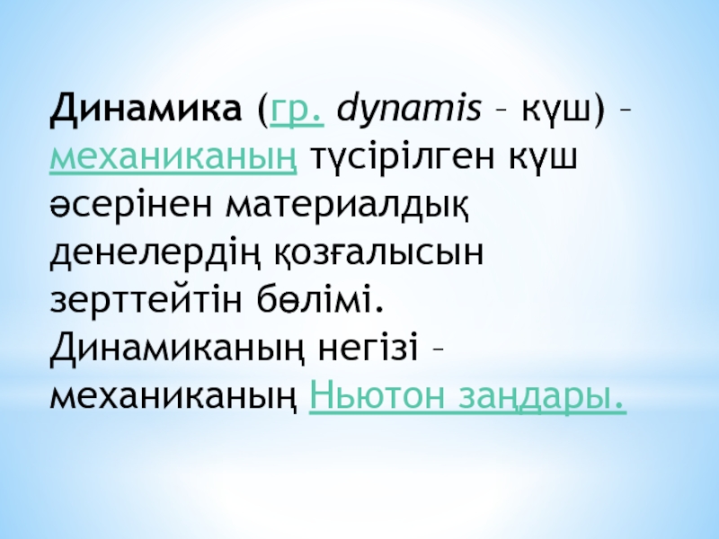 Слайд 4 Динамика (гр. dуnamіs – күш) –механиканың түсірілген күш әсерінен материалдық денелердің қозғалысын зерттейтін бөлімі.