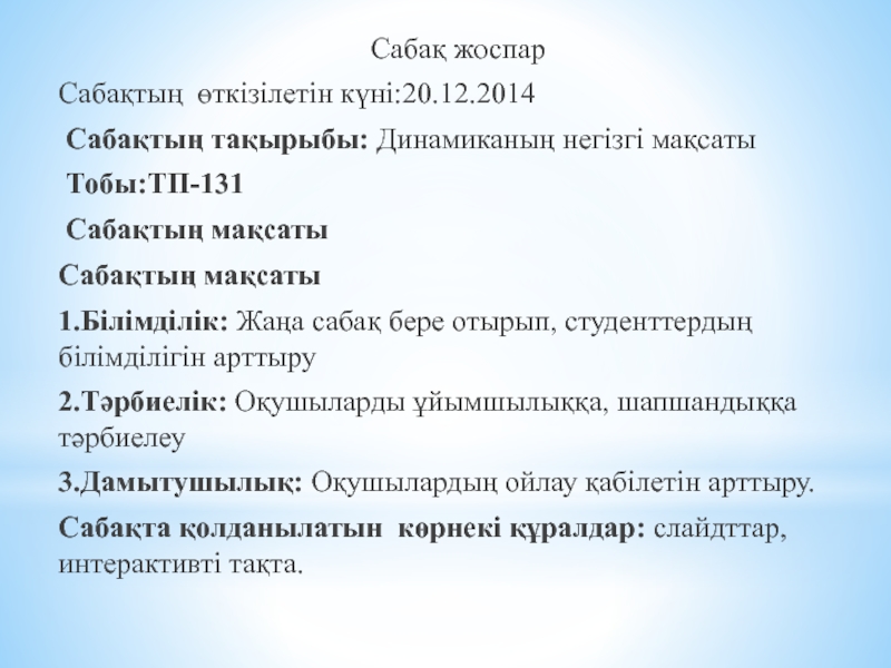 Сабақ жоспарСабақтың өткізілетін күні:20.12.2014 Сабақтың тақырыбы: Динамиканың негізгі мақсаты Тобы:ТП-131 Сабақтың мақсатыСабақтың мақсаты1.Білімділік: Жаңа сабақ бере отырып, студенттердың білімділігін арттыру2.Тәрбиелік: Оқушыларды ұйымшылыққа, шапшандыққа тәрбиелеу3.Дамытушылық: Оқушылардың ойлау қабілетін арттыру.Сабақта қолданылатын көрнекі құралдар: слайдттар,