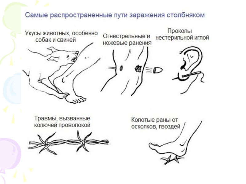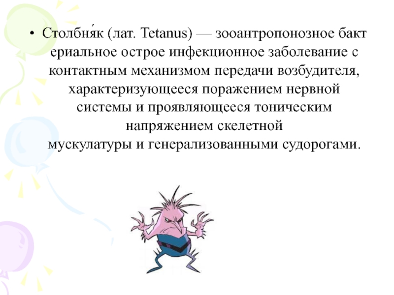 Слайд 2Столбня́к (лат. Tetanus) — зооантропонозное бактериальное острое инфекционное заболевание с контактным механизмом передачи возбудителя, характеризующееся поражением нервной системы и проявляющееся тоническим