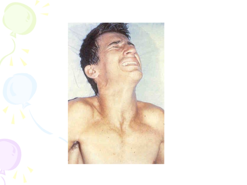 Слайд 15Тризм и risus sardonicus у пациента больного столбняком
