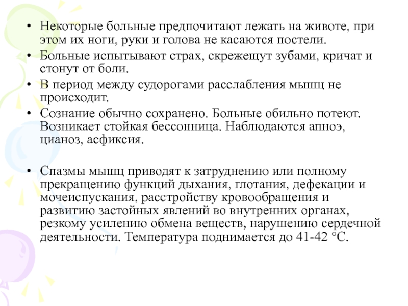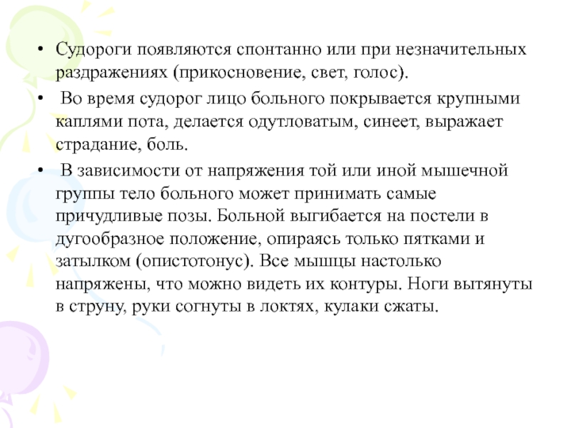 Слайд 21Судороги появляются спонтанно или при незначительных раздражениях (прикосновение, свет, голос).