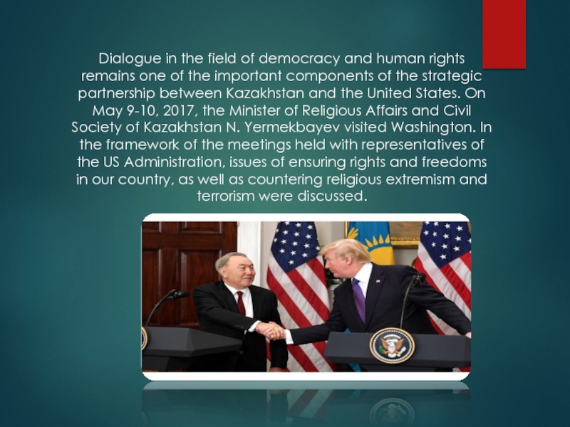 Kazakhstan and the United States. On May 9-10, 2017, the Minister of Religious Affairs and Civil Society of Kazakhstan N. Yermekbayev visited Washington. In the framework of the meetings held with representatives of the US Administration, issues of ensuring rights and freedoms in our country, as well as countering religious extremism and terrorism were discussed.