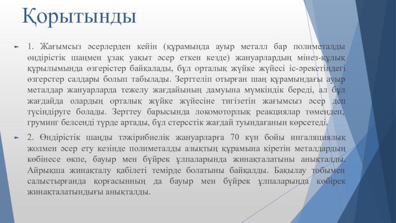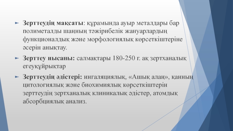 Слайд 2Зерттеудің мақсаты: құрамында ауыр металдары бар полиметалды шаңның тәжірибелік жануарлардың