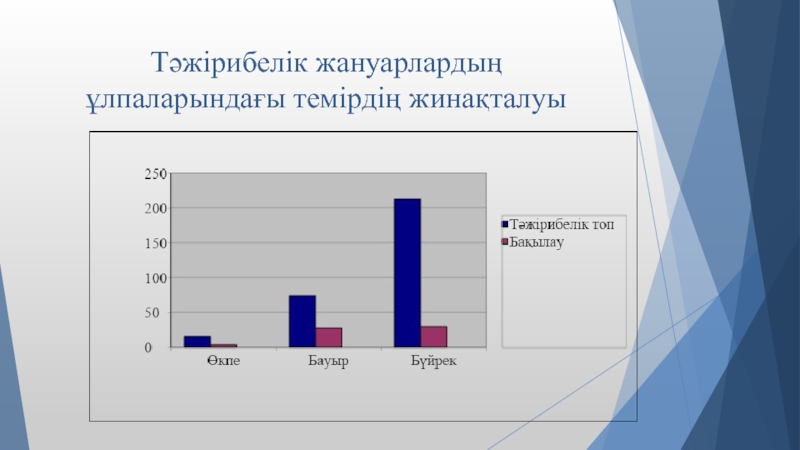 Слайд 18Тәжірибелік жануарлардың ұлпаларындағы темірдің жинақталуы