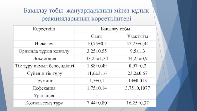 Слайд 7Бақылау тобы жануарларының мінез-құлық реакцияларының көрсеткіштері