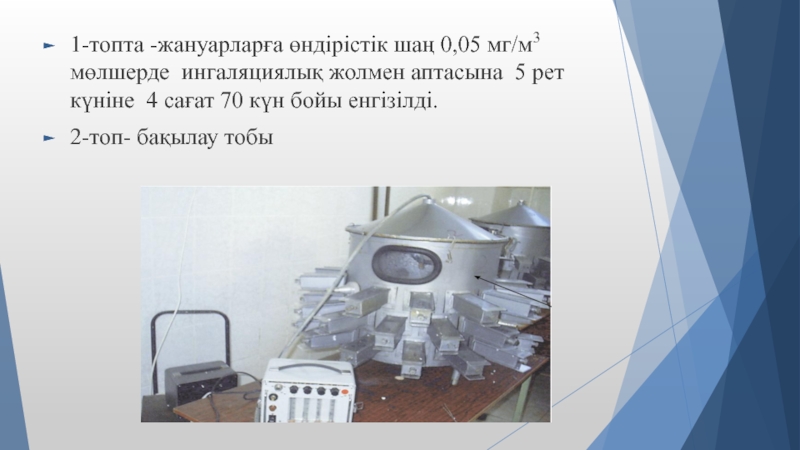 Слайд 51-топта -жануарларға өндірістік шаң 0,05 мг/м3 мөлшерде ингаляциялық жолмен аптасына