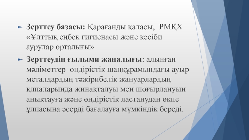 Зерттеудің ғылыми жаңалығы: алынған мәліметтер өндірістік шаңқұрамындағы ауыр