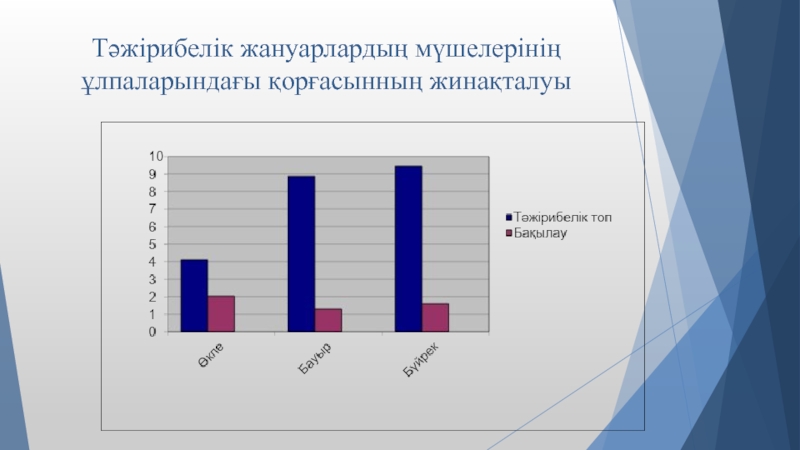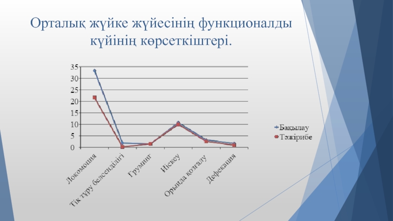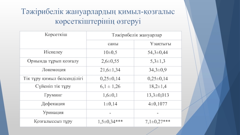 Слайд 10Тәжірибелік жануарлардың қимыл-қозғалыс көрсеткіштерінің өзгеруі